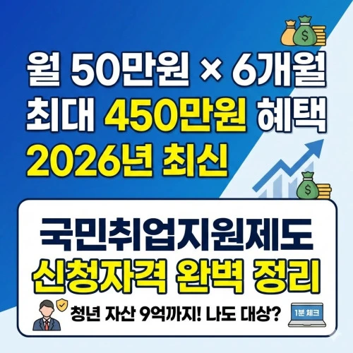 구분 Ⅰ유형 (구직촉진수당 중심) Ⅱ유형 (취업지원서비스 중심) 핵심 지원금 월 50만 원 × 6개월 (총 300만 원) 취업활동비 및 단계별 참여 수당 추가 가족 수당 부양가족 1인당 월 10만 원 (최대 40만 원) 해당 없음 소득 기준 중위소득 60% 이하 유형별 상이 (중위 100% 이하 등) 자산 기준 5억 원 이하 (청년 9억 원 이하) 제한 없음 취업성공수당 최대 150만 원 (현금 지급) 최대 150만 원 (저소득층 해당 시) 2026년부터는 청년 구직자의 독립과 자립을 돕기 위해 Ⅰ유형의 자산 요건이 9억 원으로 대폭 상향되었습니다. 따라서 부모님과 함께 거주하더라도 본인의 자산이 일정 수준 이하라면 충분히 국민취업지원제도 신청자격에 해당할 수 있습니다.
